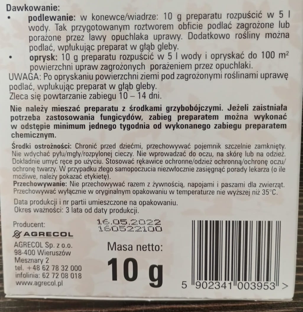 2. Oprysk: 10 g preparatu rozpuścić w 5 l wody i opryskać do 100 m2 powierzchni upraw zagrożonych porażeniem przez opuchlaki. UWAGA: po opryskaniu powierzchni ziemi pod zagrożonymi roślinami uprawę podlać, wpłukując preparat w głąb gleby.