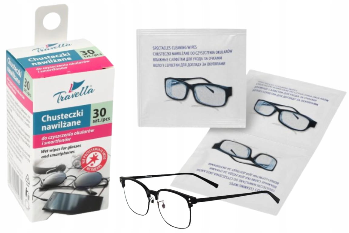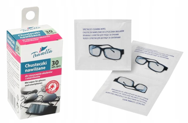Chusteczki nawilżane Travella do czyszczenia okularów i smartfonów to praktyczne rozwiązanie do utrzymywania czystości soczewek okularowych, kamer, wizjerów oraz ekranów telefonów komórkowych. Każda chusteczka skutecznie usuwa tłuszcz i brud, nie pozostawiając smug ani pyłków, co zapewnia idealne czyszczenie bez uszkadzania powierzchni.