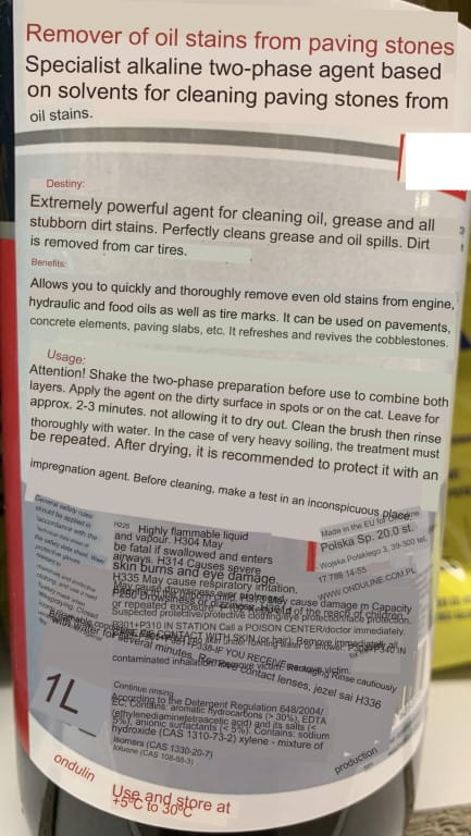 - Zastosowanie: Czyszczenie plam olejowych z kostki brukowej, betonu
