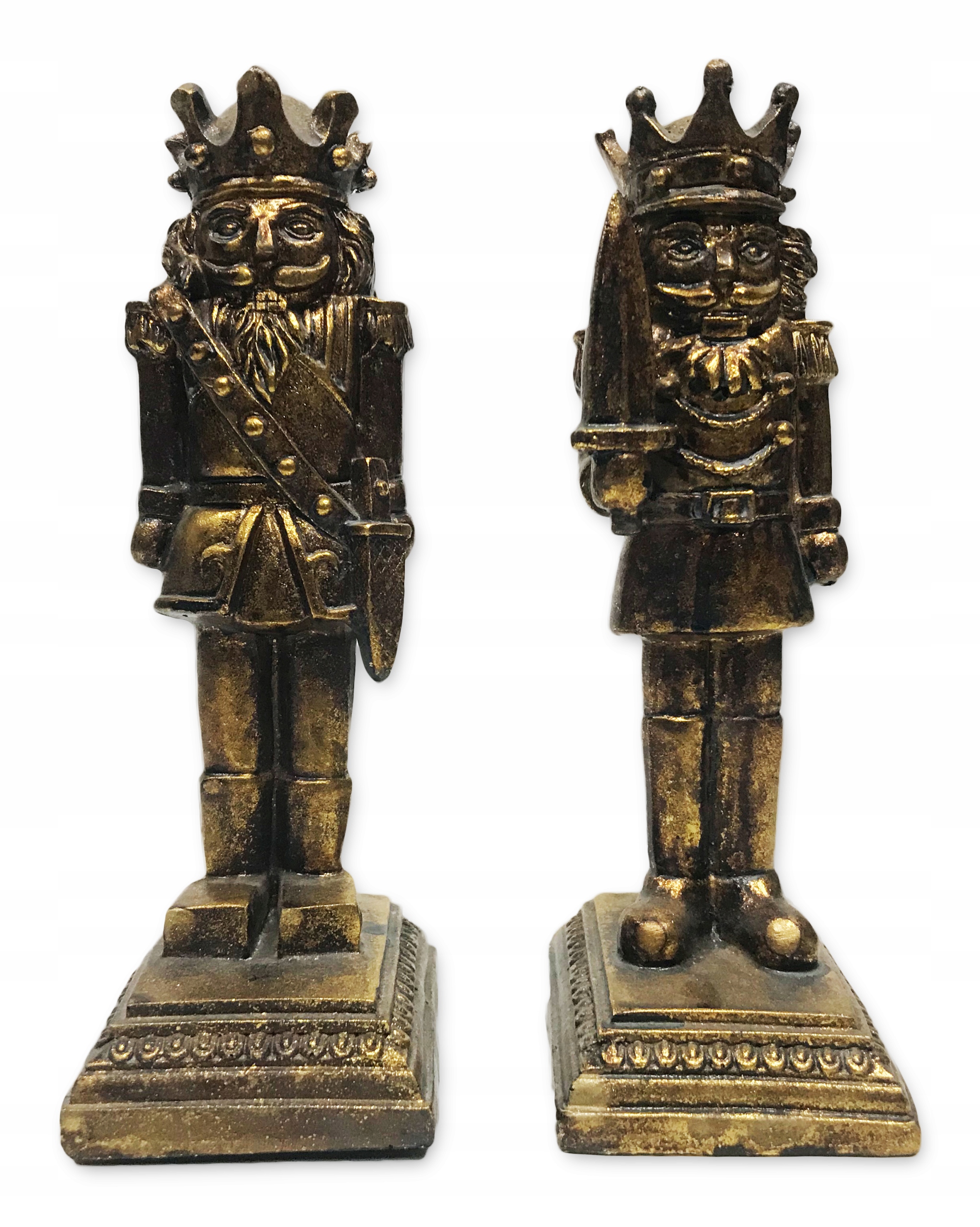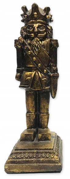 Figurka świąteczna w kształcie dziadka do orzechów idealnie wpasuje się w świąteczny klimat. Stanowi oryginalne uzupełnienie wystroju. Dekoracja nada się jako element kompozycji lub samodzielna ozdoba. Można ustawić ją w dowolnym miejscu w mieszkaniu tak by przykuła uwagę zarówno domowników jak i gości. Wykonana z wysokiej jakości drewna pokrytego złotym kolorem.