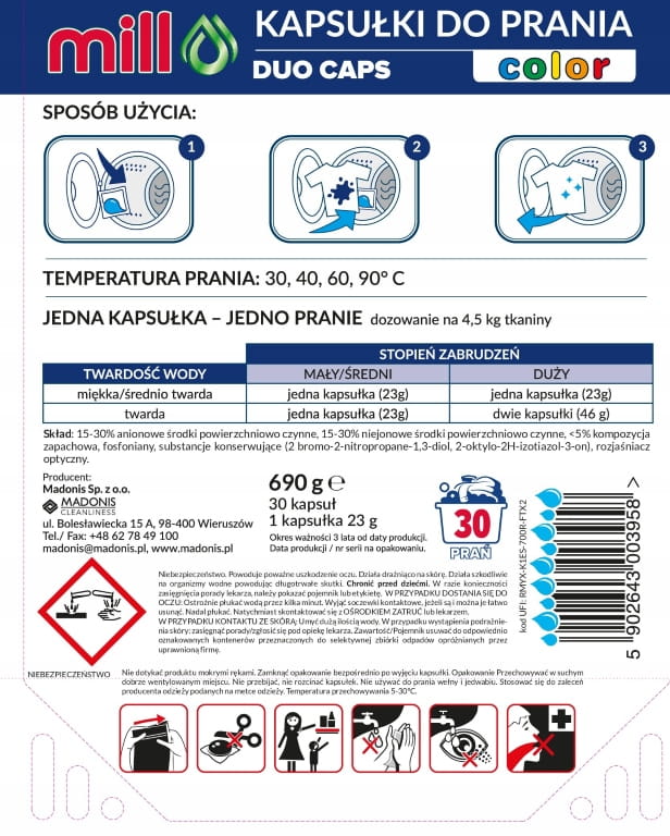 Kapsułki do prania kolorowych tkanin 30 szt Mill duo caps