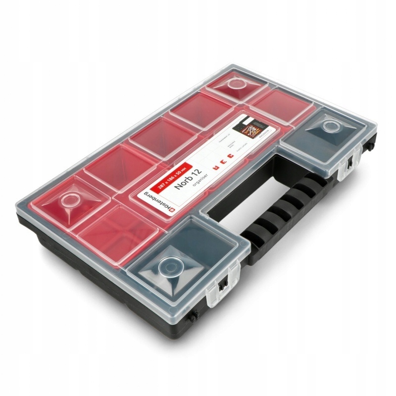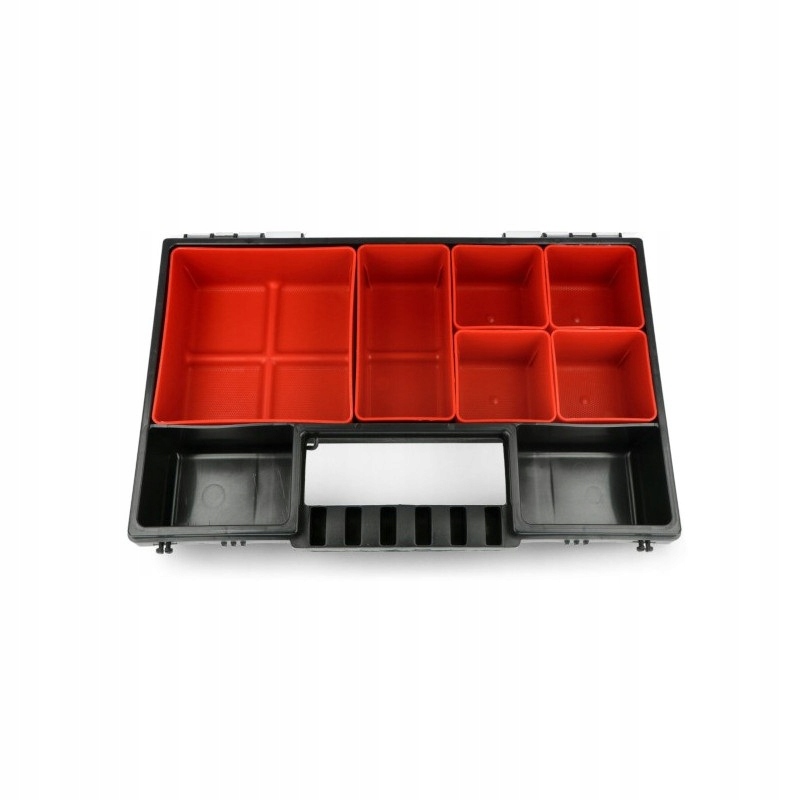 Organizer narzędziowy pomoże w pozbyciu się bałaganu w warsztacie. Dzięki niemu w szybki sposób uporządkujesz drobne narzędzia do majsterkowania, czy narzędzia elektroniczne. Posiada przegródki, które można ułożyć w dowolnej konfiguracji. Zamykanie na klipsy zapobiega wysypywaniu i przemieszczaniu się małych przedmiotów. Wygodna, ergonomiczna rączka ułatwia przenoszenie narzędzi.