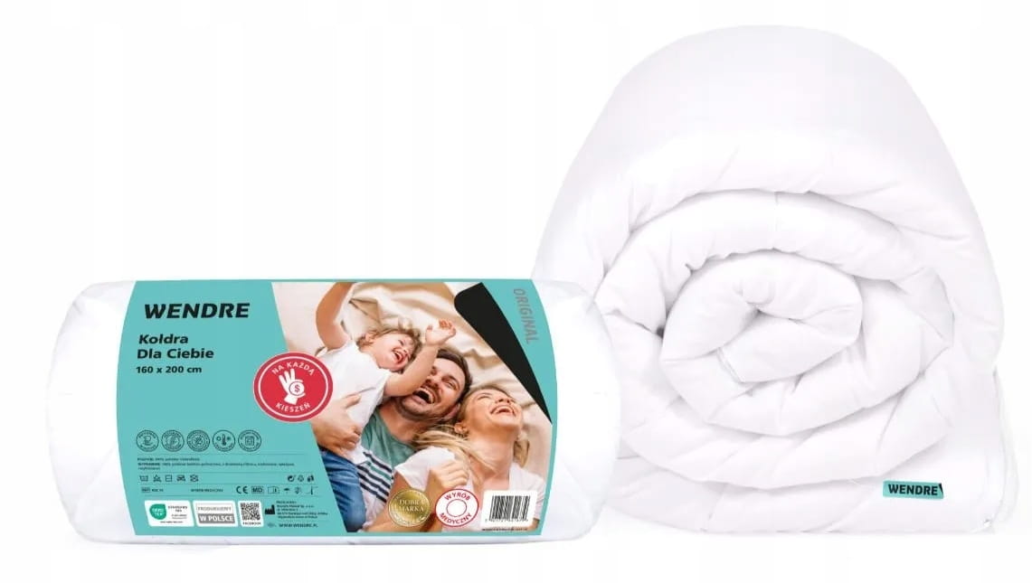 Kołdra wykonana jest z trwałych materiałów, aby zapewnić długotrwałe użytkowanie. Wykorzystujemy przyjemną w dotyku białą tkaninę z mikrofibry oraz puszyste i sprężyste wypełnienie, które gwarantuje wysoki komfort snu przez całą noc. Co więcej, wszystkie wyroby z serii "Dla Ciebie" można prać w pralce automatycznej w temperaturze 60°C, co ułatwia utrzymanie ich w czystości i higienie.