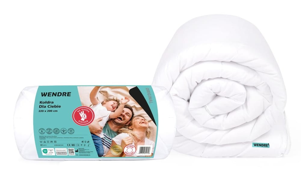 Kołdra wykonana jest z trwałych materiałów, aby zapewnić długotrwałe użytkowanie. Wykorzystujemy przyjemną w dotyku białą tkaninę z mikrofibry oraz puszyste i sprężyste wypełnienie, które gwarantuje wysoki komfort snu przez całą noc. Co więcej, wszystkie wyroby z serii "Dla Ciebie" można prać w pralce automatycznej w temperaturze 60°C, co ułatwia utrzymanie ich w czystości i higienie.