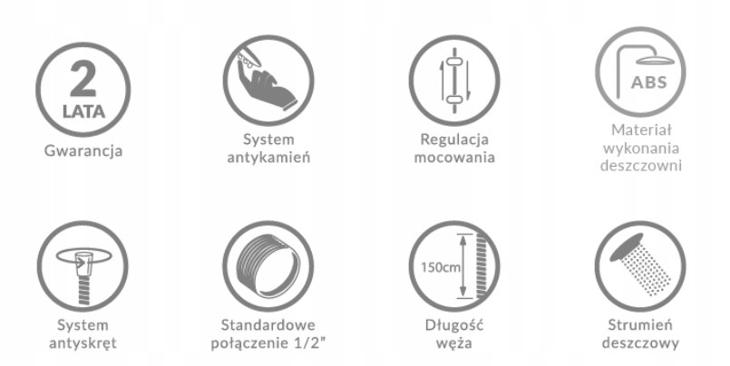 Kolumna natryskowa prysznicowa serii Alanis jest elegancka i ponadczasowa. Posiada system antykamień ułatwiający usuwanie osadów wapiennych. W zestawie z wężem wyposażonym w system antyskręt, który zapobiega plątaniu. Połączenie czerni z dwoma odcieniami złota to doskonałe i oryginalne rozwiązanie dla każdego stylu łazienek - zarówno klasycznych, jak i nowoczesnych. W zestawie znajduje się słuchawka prysznicowa, wąż prysznicowy oraz uchwyt prysznicowy.