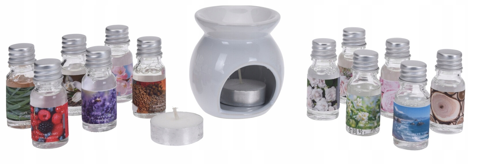 - 12 olejków o zapachach: ostry pieprz, róża, piwonia, jaśmin, wanilia, lawenda, gardenia, drzewo sandałowe, marakuja, bryza, trawa cytrynowa, kwiat wiśni