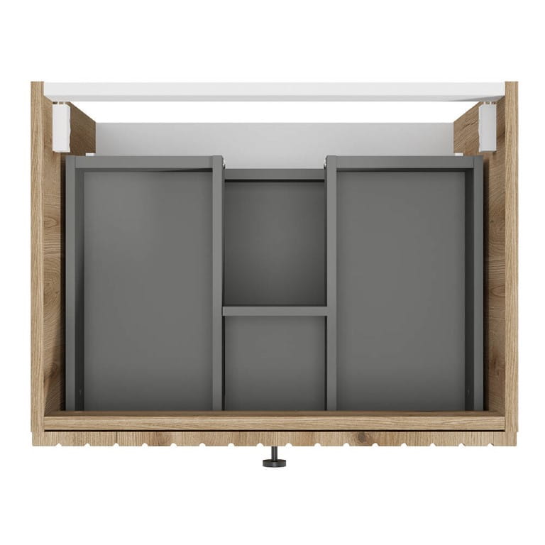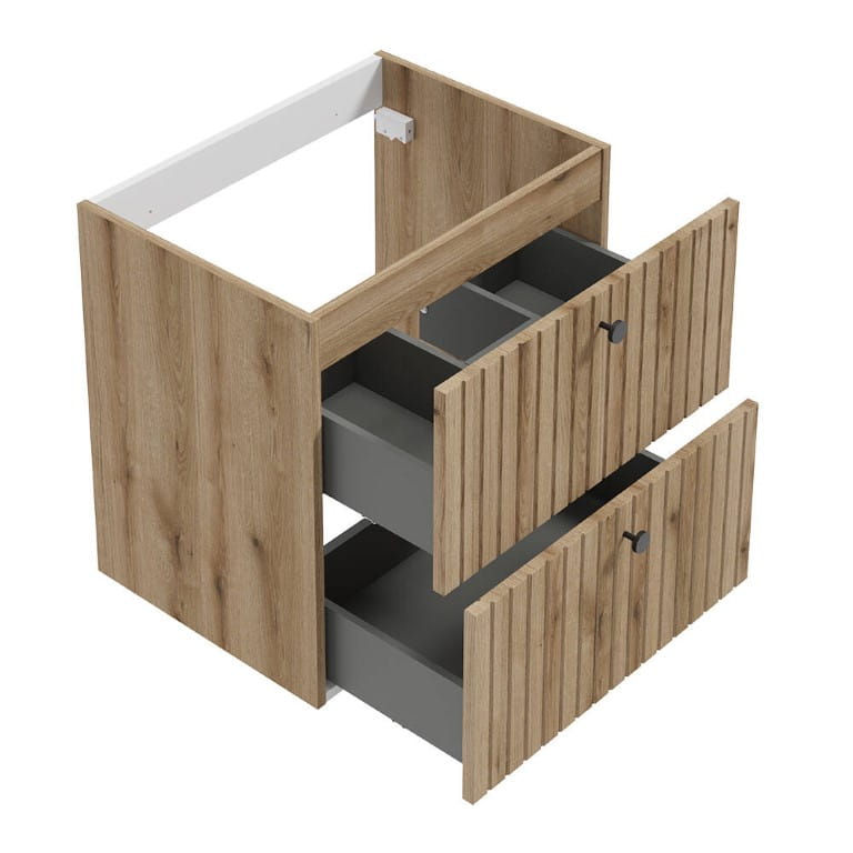 Szafka łazienkowa z umywalką 60 cm Dąb Evoke - Ta elegancka szafka łazienkowa o szerokości 60 cm z umywalką stanowi idealne połączenie stylu i funkcjonalności. Wykonana z wysokiej jakości materiałów, oferuje wyjątkowy design ryflowanych lameli, które nadają jej nowoczesny i wyrafinowany wygląd. Szafka zapewnia dużo miejsca do przechowywania, dzięki czemu Twoja łazienka będzie zawsze schludna i zorganizowana.