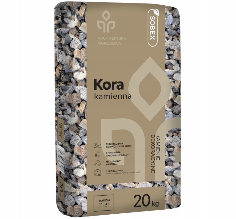 Kora kamienna Sobex 11–31 mm 20 kg to wysokiej jakości kruszywo dekoracyjne z gnejsu, które swoim wyglądem przypomina naturalną korę drewnianą. Dzięki unikalnej strukturze oraz brązowo-szarej kolorystyce doskonale komponuje się z roślinami, drewnem i nowoczesną architekturą ogrodową.