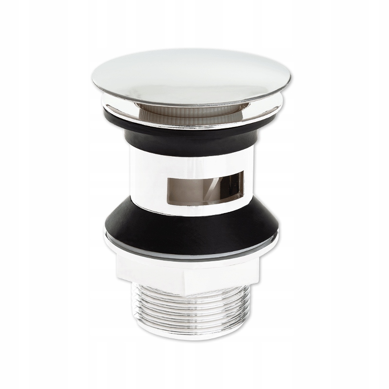 Spust do umywalki z okrągłym dużym korkiem. Korek posiada zatrzaskowy mechanizm zamykający typy „klik-klak”. Wykonany został w chromie, który stanowi idealne uzupełnienie armatury łazienkowej o podobnym wykończeniu.