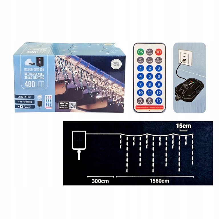 Stwórz magiczny nastrój świąt z girlandą świetlną „Sople” 480 LED, która idealnie ozdobi dach, balkon, taras lub ogród. Dzięki zasilaniu solarnemu i wbudowanemu akumulatorowi działa bez potrzeby podłączania do prądu, co czyni ją zarówno ekologiczną, jak i praktyczną. Ciepłobiałe diody LED tworzą przytulną atmosferę, a pilot zdalnego sterowania umożliwia łatwe włączanie, wyłączanie oraz zmianę trybów świecenia.