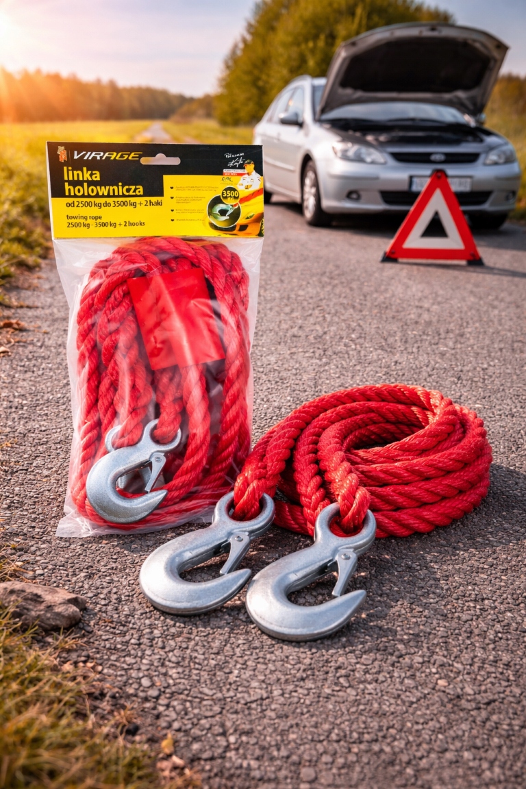 Samochodowa linka holownicza o maksymalnym naciągu 3500 kg to wytrzymałe i niezawodne rozwiązanie przeznaczone do holowania samochodów osobowych oraz dostawczych. Wykonana z trwałego, plecionego tworzywa sztucznego zapewnia wysoką odporność na zerwanie oraz stabilność podczas użytkowania.