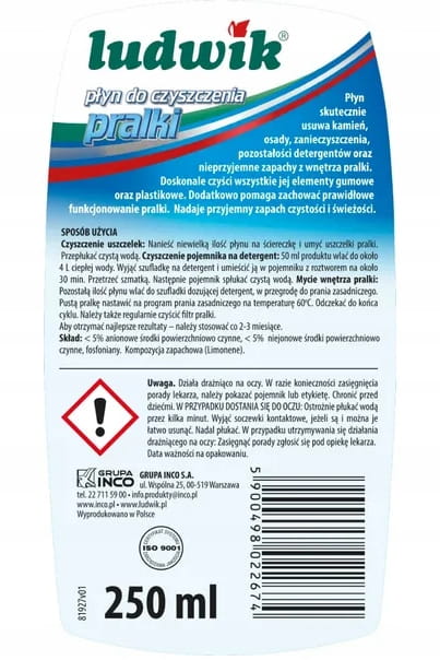 Ludwik Pro Clean - rewolucyjny środek do pielęgnacji pralek, który zmieni sposób, w jaki dbasz o swoje urządzenie. Ta zaawansowana formuła skutecznie usuwa kamień, osady i zanieczyszczenia, pozostawiając wnętrze pralki czyste, świeże i pachnące. Ale to jeszcze nie wszystko!