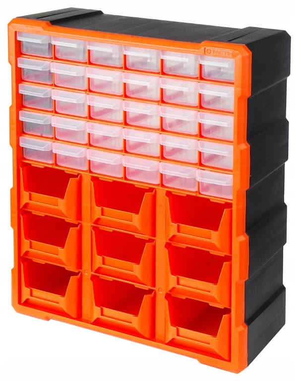 Plastikowy organizer warsztatowy to niezbędne narzędzie dla profesjonalistów i majsterkowiczów, którzy cenią sobie porządek i efektywność pracy. Zbudowany z wytrzymałego plastiku, ten organizer oferuje 30 przezroczystych szuflad i 9 kuwet, zapewniając wystarczającą przestrzeń do przechowywania narzędzi i części.