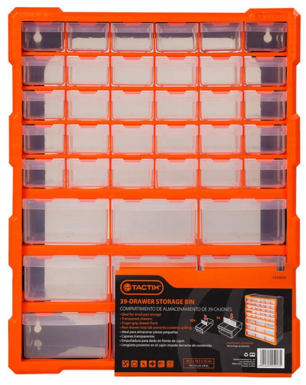 Organizer warsztatowy plastikowy z 39 szufladkami marki TACTIX zaprojektowany został z myślą o wygodnym i uporządkowanym przechowywaniu różnorodnych akcesoriów. Dzięki precyzyjnemu i estetycznemu wykonaniu, doskonale sprawdzi się również w domowych pomieszczeniach, pozwalając na przechowywanie drobnych przedmiotów.