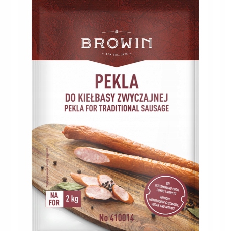 Pekla do kiełbasy zwyczajnej marki Browin to selekcja najlepszych, starannie dobranych ziół, które nadają mięsu niesamowity smak i aromat. Polecany do kiełbas parzonych i wędzonych. Dzięki peklowaniu mięso zachowuje swój kolor oraz zyskuje stabilność mikrobiologiczną.