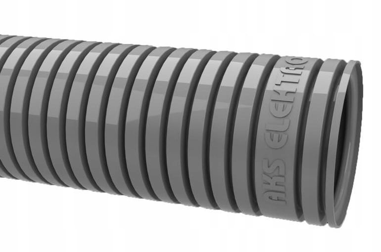Rura instalacyjna, karbowana, giętka, nie rozprzestrzeniająca płomienia wykonana z PCV w kolorze szarym.