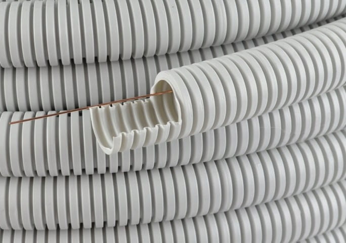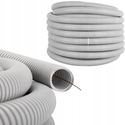 Rura instalacyjna, karbowana, giętka, nie rozprzestrzeniająca płomienia wykonana z PCV w kolorze szarym.