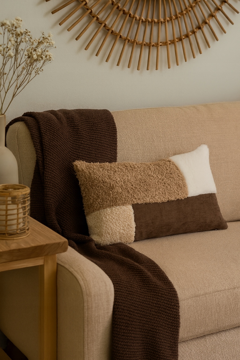 Dzięki temu kształtuje ciekawy, nowoczesny patchworkowy wzór w odcieniach brązu, beżu i ecru, który świetnie komponuje się z każdym stylem aranżacji – od skandynawskiego po boho. Poduszka doskonale sprawdzi się na sofie, fotelu lub łóżku, zapewniając komfort i estetyczny wygląd.