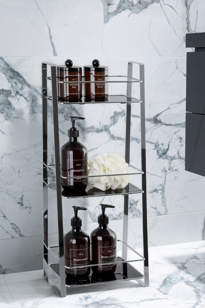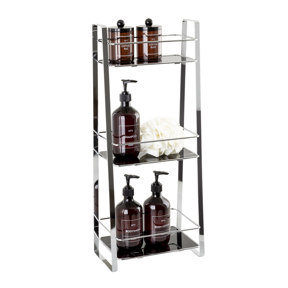 Regał wykonany jest ze stali chromowanej oraz trwałego tworzywa sztucznego, co zapewnia stabilność konstrukcji oraz odporność na wilgoć. Trzy poziomy przechowywania oferują wygodną przestrzeń na kosmetyki, środki czystości oraz drobne akcesoria domowe, a kompaktowa forma pozwala zaoszczędzić miejsce nawet w niewielkich pomieszczeniach. Gładkie powierzchnie są łatwe w czyszczeniu i utrzymaniu w dobrym stanie.