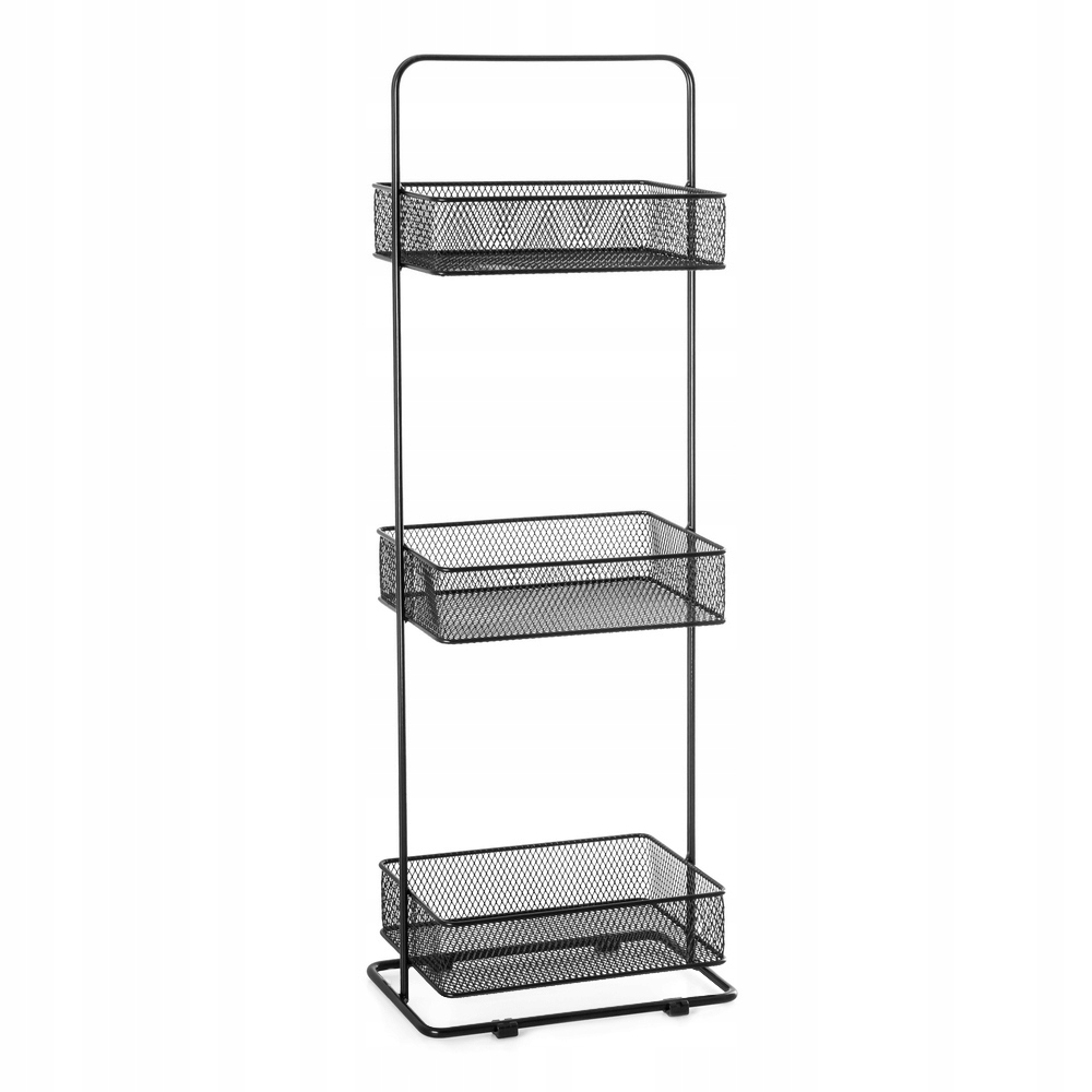 Trzy ażurowe koszyki z metalowej siateczki zapewniają dobrą cyrkulację powietrza, co jest szczególnie praktyczne w wilgotnych pomieszczeniach. Regał jest wyposażony w stopki z tworzywa sztucznego, które chronią podłogę przed zarysowaniami oraz zwiększają stabilność całej konstrukcji. Dodatkowym atutem jest bardzo prosty montaż – produkt nie wymaga skręcania, wystarczy ustawić go w wybranym miejscu i od razu można z niego korzystać.