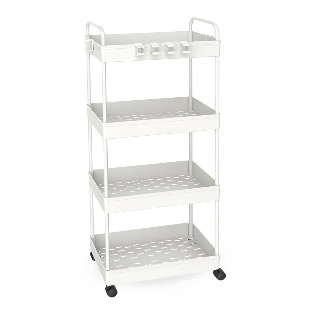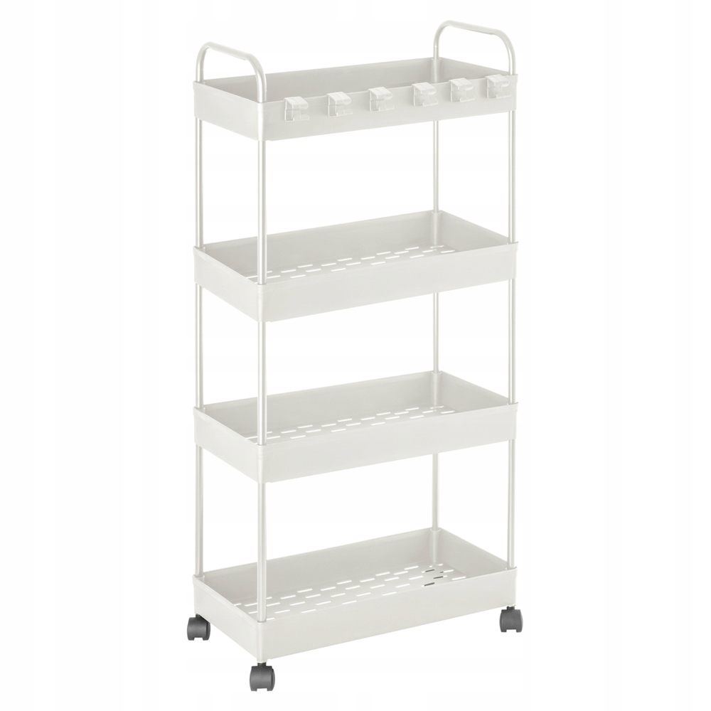 Regał wyposażony jest w cztery pojemne kosze, które umożliwiają uporządkowanie kosmetyków, akcesoriów, środków czystości lub narzędzi. Dodatkowym atutem jest sześć praktycznych haczyków, które można dowolnie rozmieszczać na półkach, optymalizując przestrzeń i zapewniając szybki dostęp do drobnych elementów. Zamontowane kółka pozwalają na łatwe i wygodne przemieszczanie regału w zależności od potrzeb.