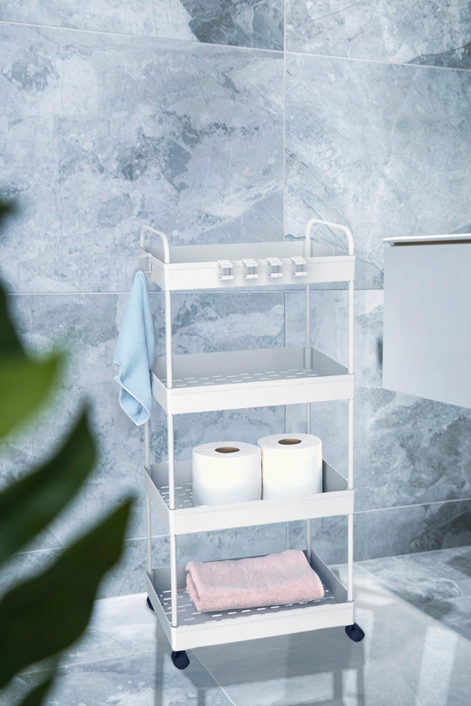Wielofunkcyjny regał łazienkowy na kółkach to praktyczne rozwiązanie do przechowywania i organizacji różnorodnych przedmiotów w łazience, kuchni, salonie fryzjerskim lub innych pomieszczeniach użytkowych. Wykonany z trwałego tworzywa sztucznego oraz solidnego metalowego stelaża, zapewnia stabilność i wytrzymałość podczas codziennego użytkowania.