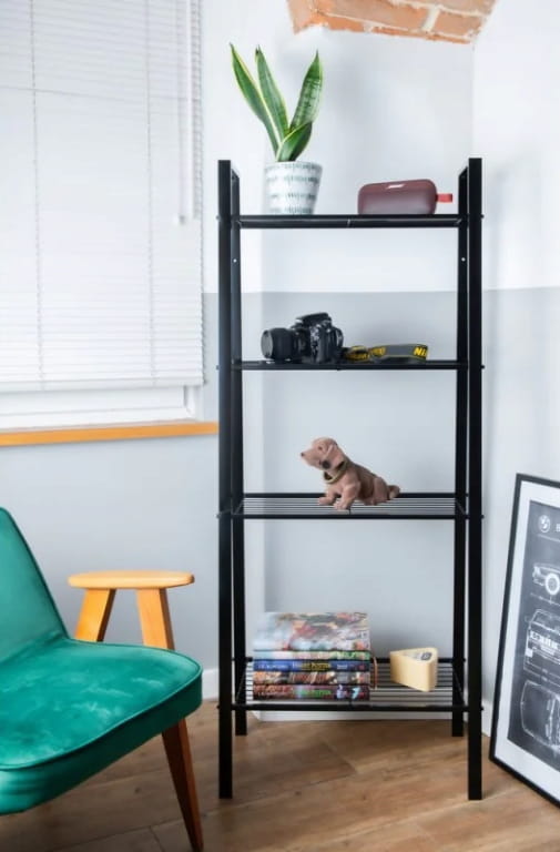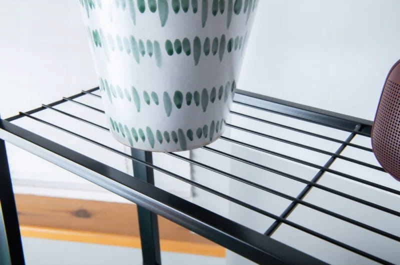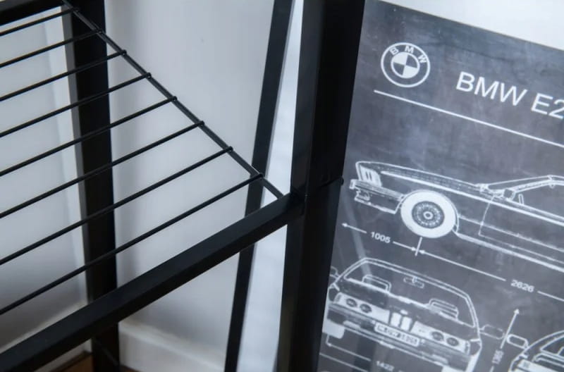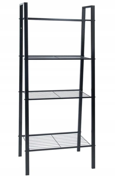 Drabinkowy regał w kolorze czarnym z czterema półkami wykonanymi z szerokiego drutu to doskonałe rozwiązanie do przechowywania i eksponowania różnych przedmiotów w Twoim domu. Wykonany z trwałej stali i malowany na elegancki, matowy czarny kolor, łączy w sobie nowoczesny styl oraz solidną konstrukcję, zapewniając zarówno funkcjonalność, jak i estetyczny wygląd.
