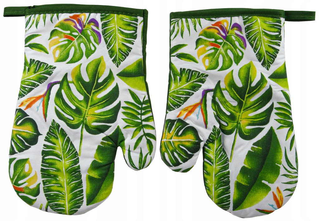 Rękawice kuchenne z magnesem LEAVES kpl 2 szt., prawa + lewa. Materiał 100% poliester z nadrukiem, wypełnienie z włókniny. Wszyty magnes. Wzór z motywem liści. Posiadają certyfikat CE.