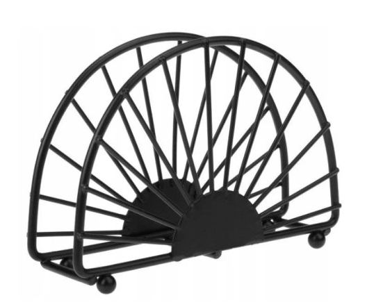 Serwetnik został wykonany z drutu stalowego malowanego proszkowo w kolorze czarny mat. Charakteryzuje się dużą ilością szczegółów i niebanalnym kształtem, łączący w sobie klasyczne i współczesne elementy wzornictwa. Stabilny, praktyczny i niezbędny na stole w każdym domu, hotelu czy restauracji. Z pewnością pomieści dużą ilość serwetek, dodatkowo ozdobi każdy stół.