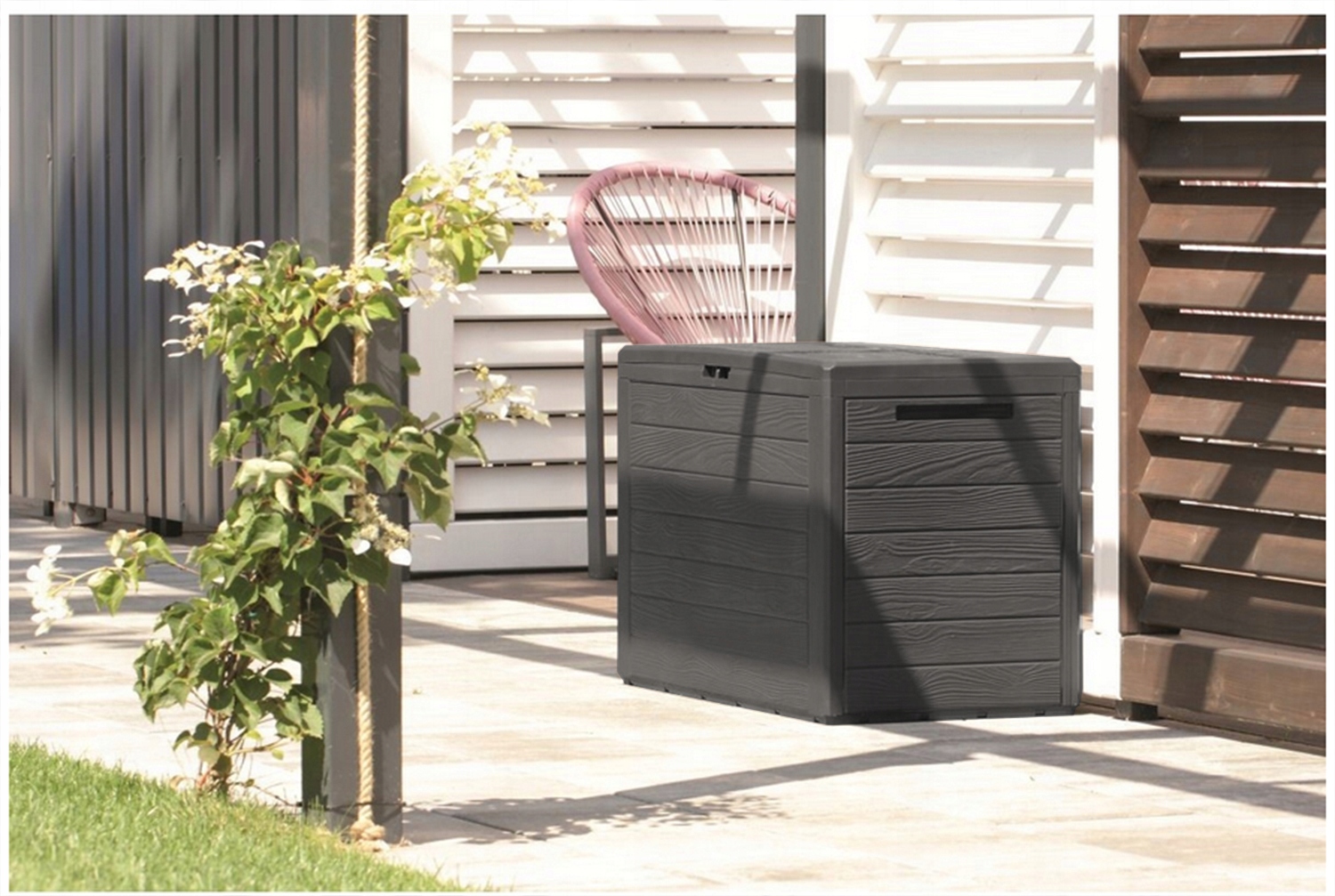 Skrzynia ogrodowa Woodebox o pojemności 140 litrów w kolorze antracyt to praktyczne i estetyczne rozwiązanie do przechowywania akcesoriów ogrodowych. Jej powierzchnia inspirowana strukturą drewna nadaje elegancki wygląd, który doskonale komponuje się z ogrodem, tarasem lub balkonem. Stonowany kolor antracyt podkreśla nowoczesny charakter i pasuje do różnych aranżacji.