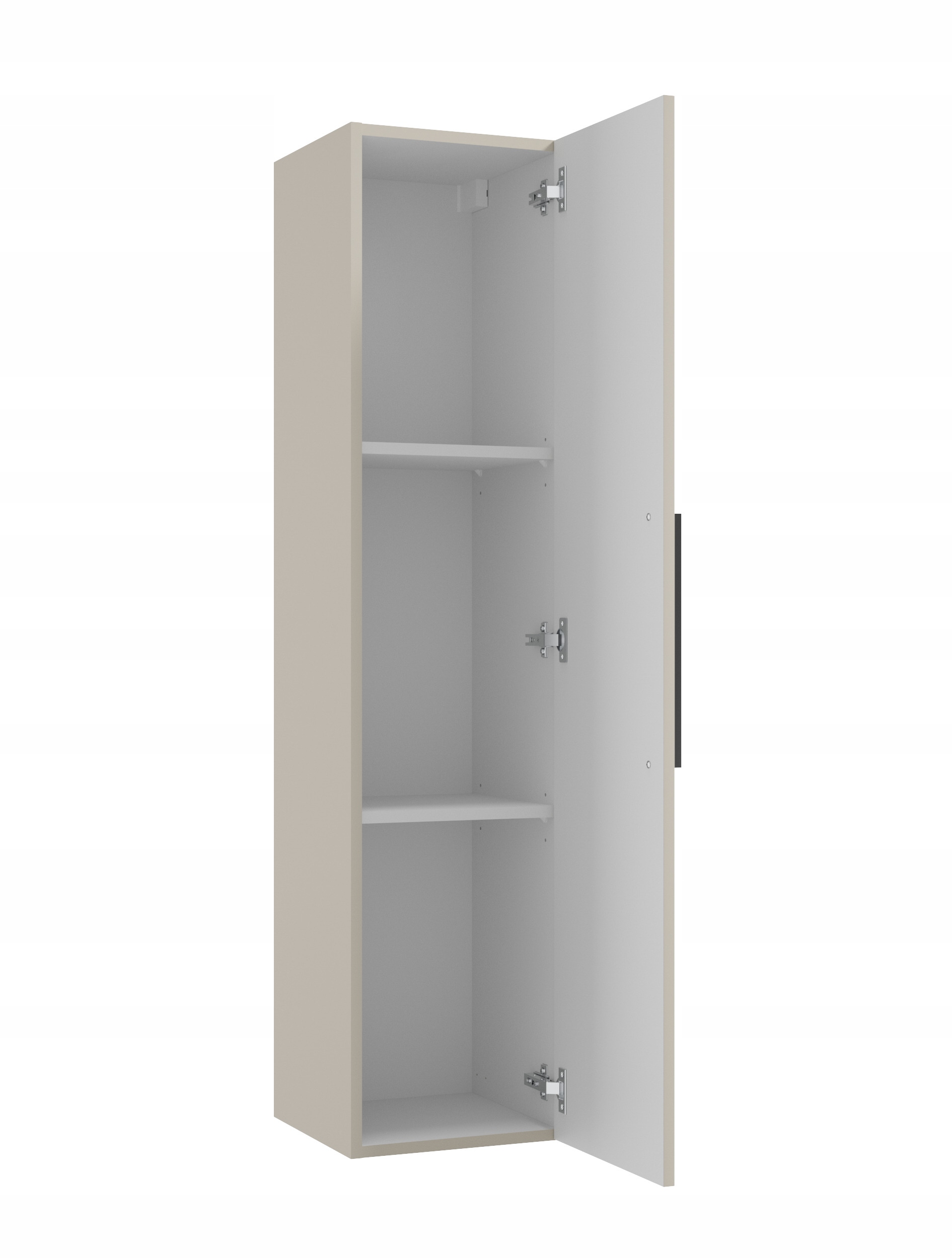 Pozostawienie przestrzeni nad i pod meblem poprawia cyrkulację powietrza oraz umożliwia wygodne sprzątanie. Drzwiczki wyposażone są w klasyczny, metalowy uchwyt w kolorze czarnym, który elegancko kontrastuje z modnym odcieniem kaszmir. Szafka posiada system cichego domyku, zapewniający komfort codziennego użytkowania.