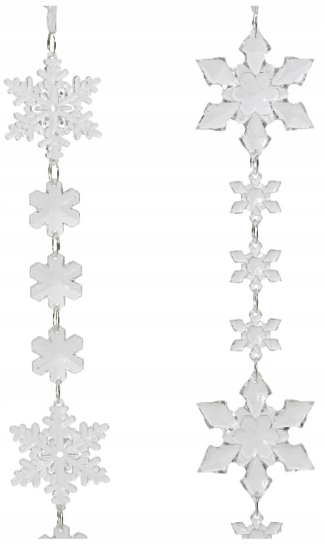 Elegancka girlanda świąteczna w formie subtelnych płatków śniegu, które idealnie oddają zimowy klimat. Delikatne śnieżynki, połączone w długą kompozycję, tworzą lekką, zwiewną ozdobę, idealną do zawieszenia na oknie, ścianie, czy choince. Przezroczyste, symetryczne płatki śniegu różnej wielkości tworzą wizualny efekt przypominający opadające na ziemię śnieżynki, nadając każdemu wnętrzu świeżości i zimowej elegancji.