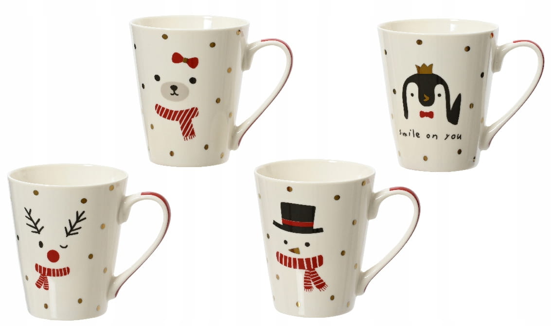 Oryginalny kubek porcelanowy o pojemności 305 ml z motywami świątecznymi, które przedstawiają urocze postacie: niedźwiedzia, bałwana, pingwina oraz renifera. Wykonany z wysokiej jakości porcelany, charakteryzuje się trwałością i eleganckim wykończeniem z kalkomanią. Idealny na prezent lub jako element świątecznej zastawy stołowej.