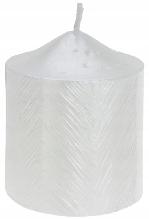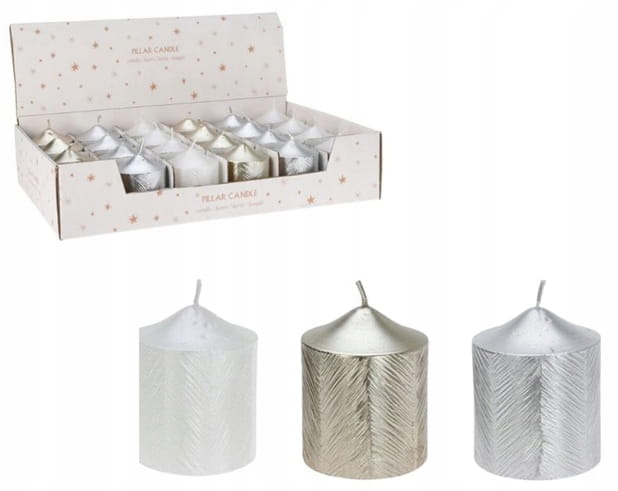 Elegancka świeca dekoracyjna z metalicznym połyskiem i wzorem, dostępna w trzech kolorach: białym, srebrnym i złotym, to idealny dodatek do każdego wnętrza, który przyciąga wzrok i tworzy wyjątkowy klimat.
