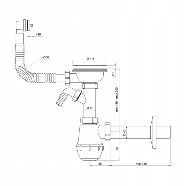 Syfon zlewozmywakowy butelkowy pojedynczy, z zamykanym sitkiem 90 mm, ze stali nierdzewnej Inox. Syfon posiada wyjściem umożliwiające podłączenia węża pralki lub zmywarki.
