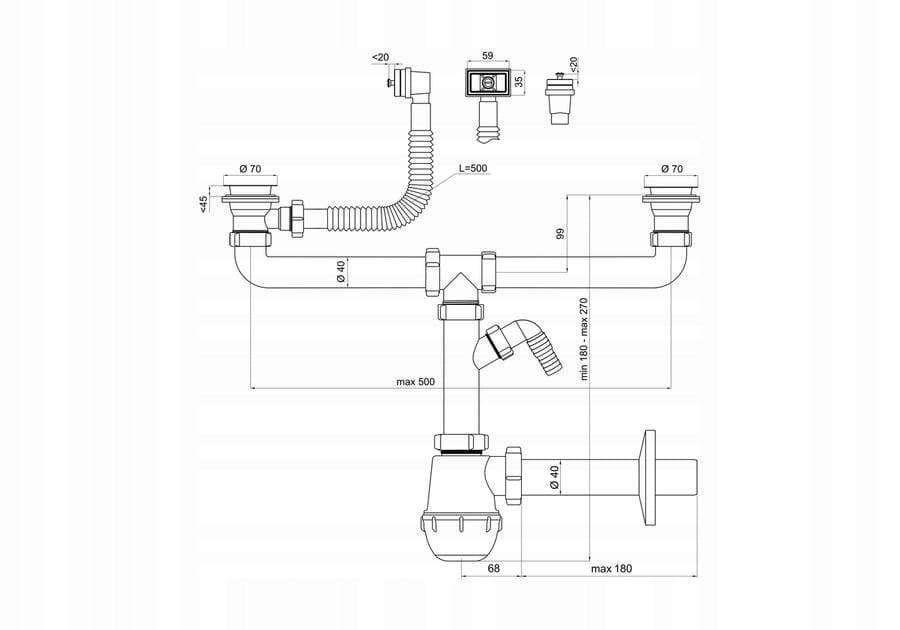 Syfon zlewozmywakowy z przelewem prostokątnym 70 mm