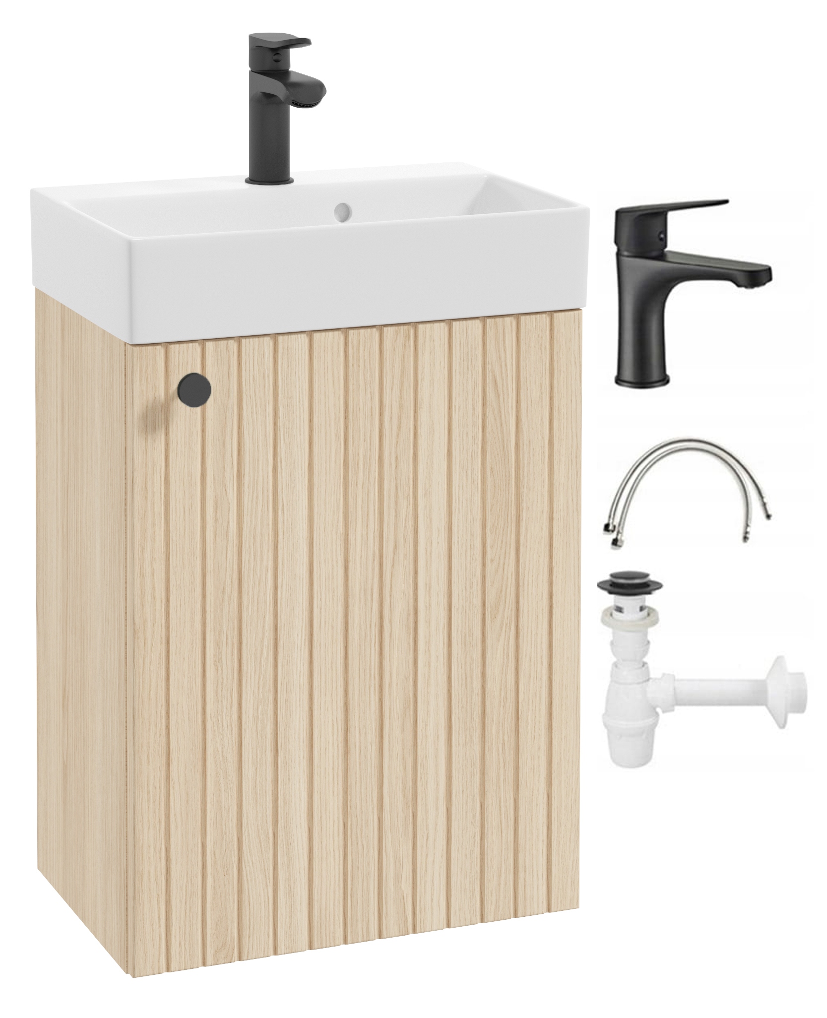 ✅ Zestaw zawiera: szafka + umywalka + bateria czarna + korek klik-klak + uchwyt czarny