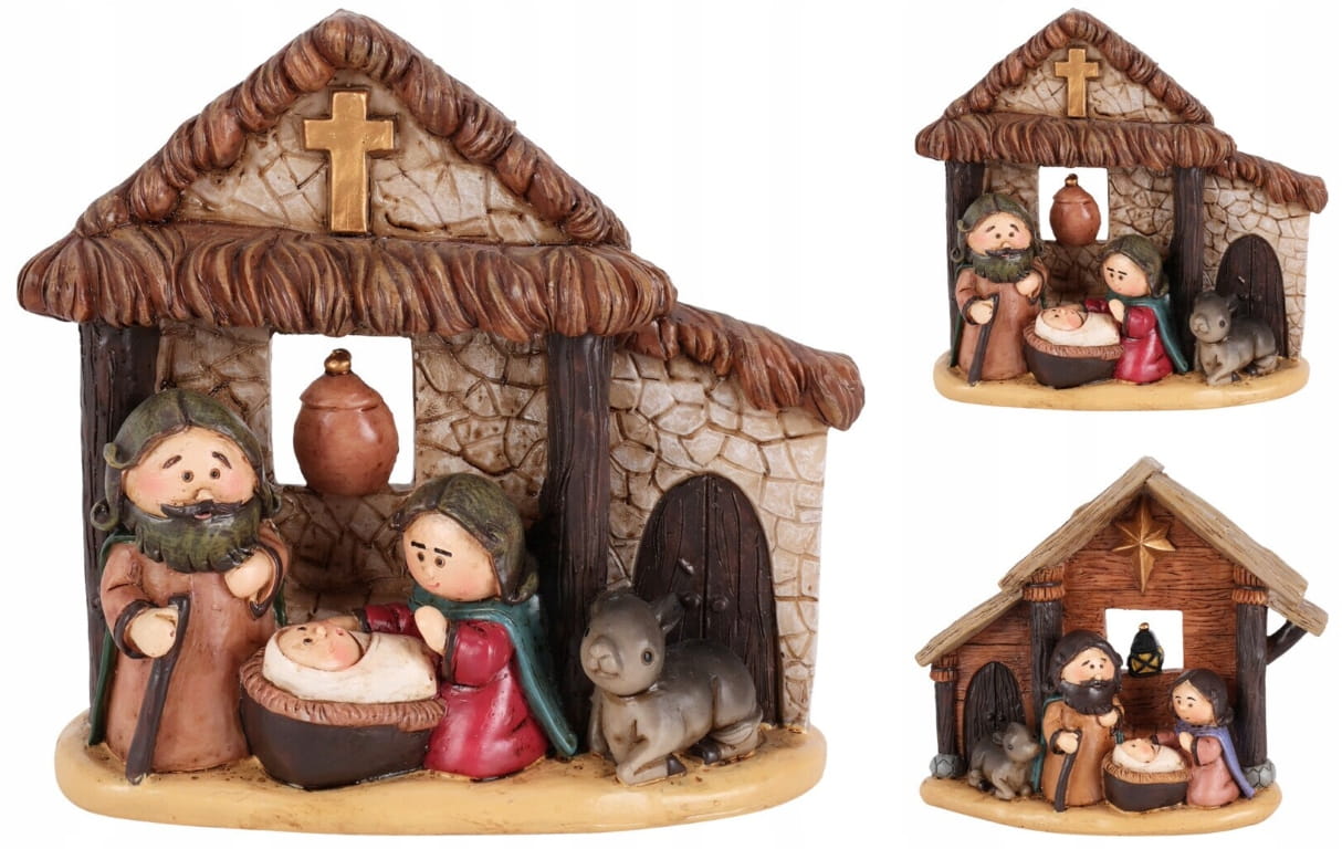 Szopka bożonarodzeniowa o wymiarach 15x14 cm to doskonała dekoracja na czas Świąt Bożego Narodzenia. Figurka przedstawia tradycyjne sceny z narodzin Jezusa, w tym postaci Maryi, Józefa i Dzieciątka Jezus w stajence. Wykonana z wysokiej jakości materiałów, szopka wyróżnia się precyzyjnym wykonaniem i starannie dopracowanymi detalami, co dodaje jej wyjątkowego, klasycznego uroku.