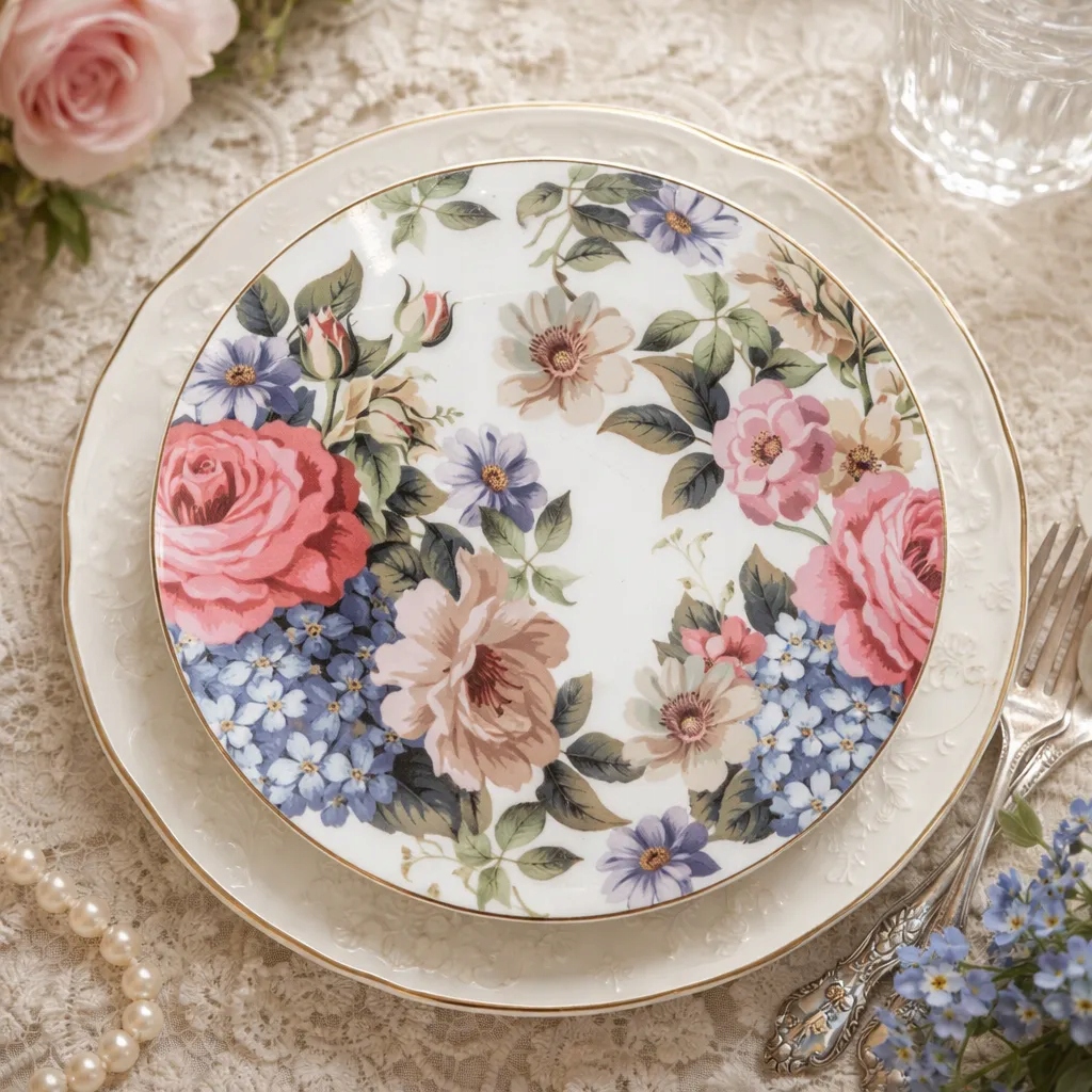 ✅ Delikatny, romantyczny wzór kwiatowy – subtelne róże i pastelowe kwiaty