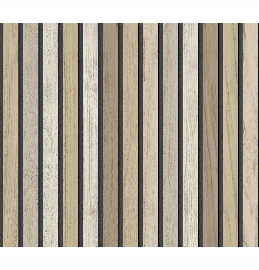 Tapeta winylowa na flizelinie z motywem drewnianych lameli to stylowe rozwiązanie, które wprowadza do wnętrza ciepło i nowoczesny charakter. Realistyczna imitacja pionowych paneli drewnianych nadaje ścianie elegancki, dekoracyjny efekt.