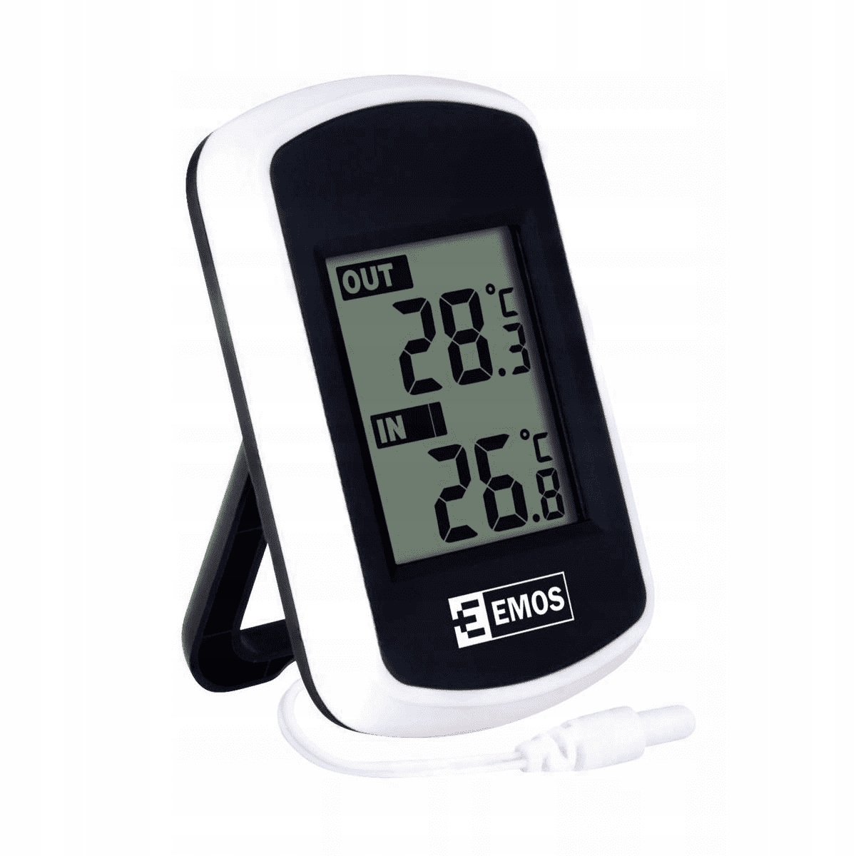 Termometr przewodowy z wyświetlaniem temperatury wewnętrznej i zewnętrznej. Termometr ma sondę przewodową o długości 2 m.