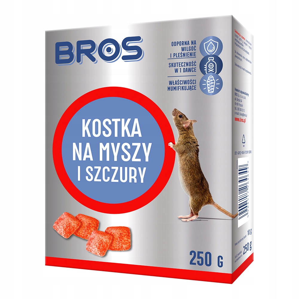 - Preparat dla użytku profesjonalnego Bros kostki na myszy i szczury jest przeznaczony do zwalczania myszy domowej (mus musculus), oraz szczura wędrownego (rattus norvegicus) wewnątrz i wokół budynków