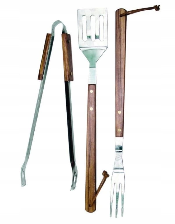 Solidny zestaw narzędzi do grillowania zapewnia pewny chwyt i składa się z trzech elementów: szczypiec, łopatki i widelca. Wykonane z wysokiej jakości stali nierdzewnej, chromowanej i pokrytej powłoką ochronną, narzędzia są niezbędne do przygotowywania i smażenia posiłków podczas grillowania. Posiadają drewniane rączki oraz sznureczki do zawieszenia, co umożliwia łatwy dostęp i wygodę użytkowania.